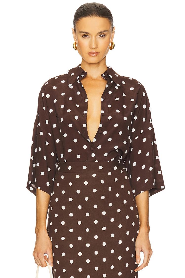 Effortless charm defines this oversized shacket in a matte brown base adorned with classic white polka dots all over. Crafted from lightweight viscose poplin, it features a relaxed fit with elbow-length regular sleeves and a structured collar, finished with a front button closure. Its hip-length cut and minimalist style make it a versatile layering piece ideal for casual brunches, workwear, or relaxed weekend outings. The playful polka dot pattern adds a subtle vintage flair, while the breathable fabric ensures comfort across spring, summer, and autumn seasons.