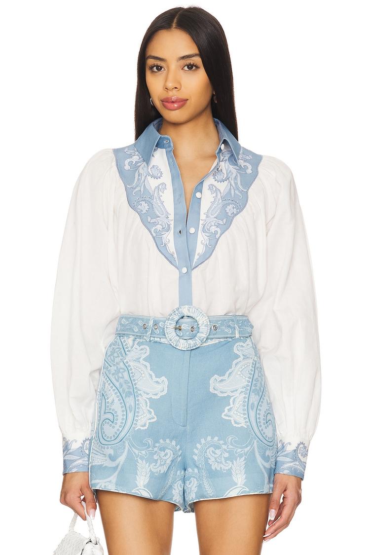Softly structured in a midweight linen-cotton blend, this elegant yoke shirt features a classic collar and long sleeves with delicate paisley embroidery on the collar and cuffs. The front button closure and regular fit provide timeless sophistication, while the hip length offers versatility for both workwear and casual brunches. Its white base with light blue paisley accents delivers a fresh, polished look ideal for spring, summer, and autumn occasions.