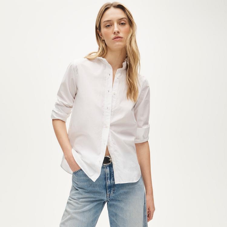Crisp cotton poplin and a classic fit define this hip-length Jules ruffle-collar shirt. Featuring a high neckline with delicate ruffle detailing and long regular sleeves, it offers a timeless preppy style perfect for casual days, workwear, or brunch outings. The solid white base enhances its minimalist charm, while the covered back and button closure add to its polished look. This versatile shirt embodies classic elegance with subtle feminine flair, making it an essential wardrobe staple for year-round wear.