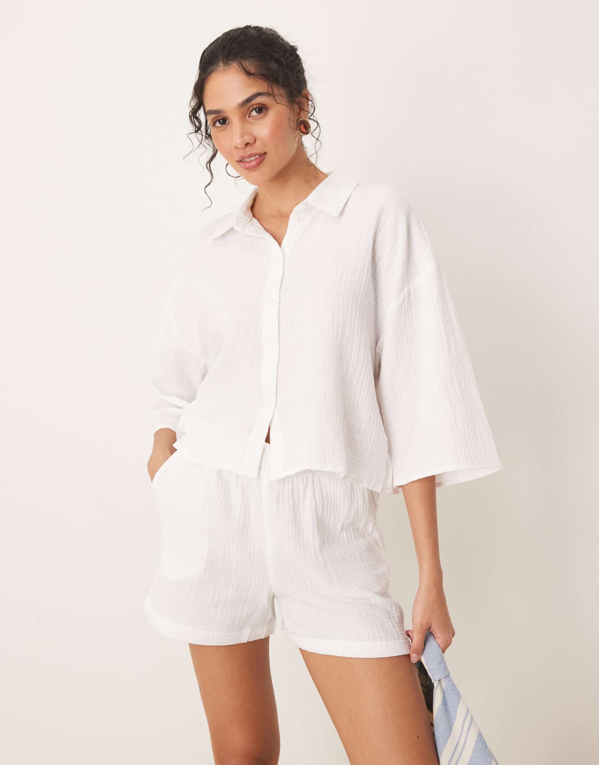 Crisp white cotton cheesecloth fabric and a cropped silhouette define this regular fit shirt featuring a classic spread collar and convenient front button placket. The relaxed drop-shoulder three-quarter sleeves enhance its casual chic vibe, while the textured weave adds subtle visual interest. Ideal for laid-back brunches, beach vacations, or everyday warm-weather wear, this versatile cropped shirt pairs effortlessly with shorts or high-waisted bottoms for a fresh spring and summer look.