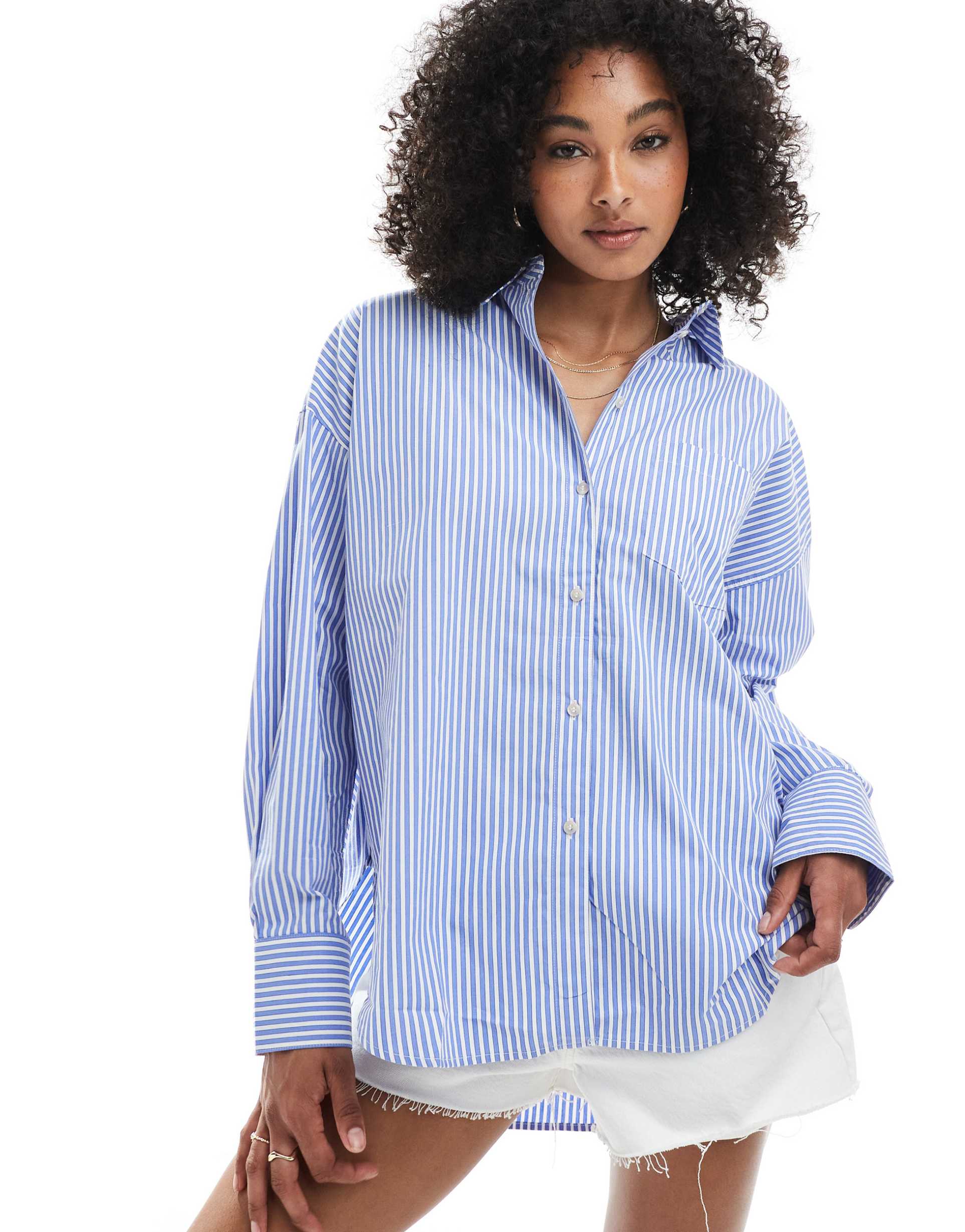 Effortlessly chic, this oversized poplin shirt features classic blue and white stripes that lend a timeless appeal. Crafted from crisp cotton with a woven texture, it boasts a spread collar and long sleeves with buttoned cuffs for a polished finish. The hip-length silhouette with a longer curved back hem enhances its relaxed fit, perfect for casual outings, workwear, or weekend brunches. The front button placket and chest patch pocket add subtle functional details, making this shirt a versatile staple for transitional seasons.