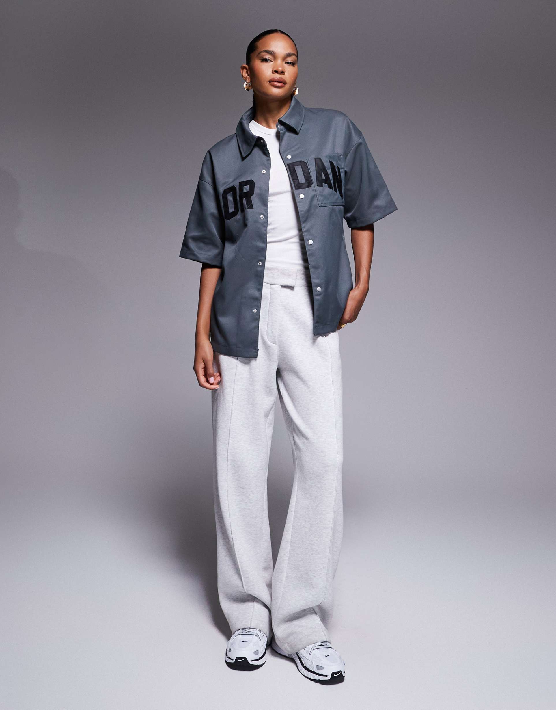 Dark gray woven cotton fabric defines this classic Jordan shirt featuring a spread collar and snap button placket for easy wear. Designed with half sleeves and a regular fit, it offers relaxed comfort and a timeless silhouette. The solid dark gray base is accented by bold black lettering across the chest, complemented by a practical chest pocket. Its hip-length cut makes it ideal for layering over tees or pairing with casual trousers. Perfect for casual outings, streetwear looks, and everyday wear, this shirt blends comfort with iconic sporty style.
