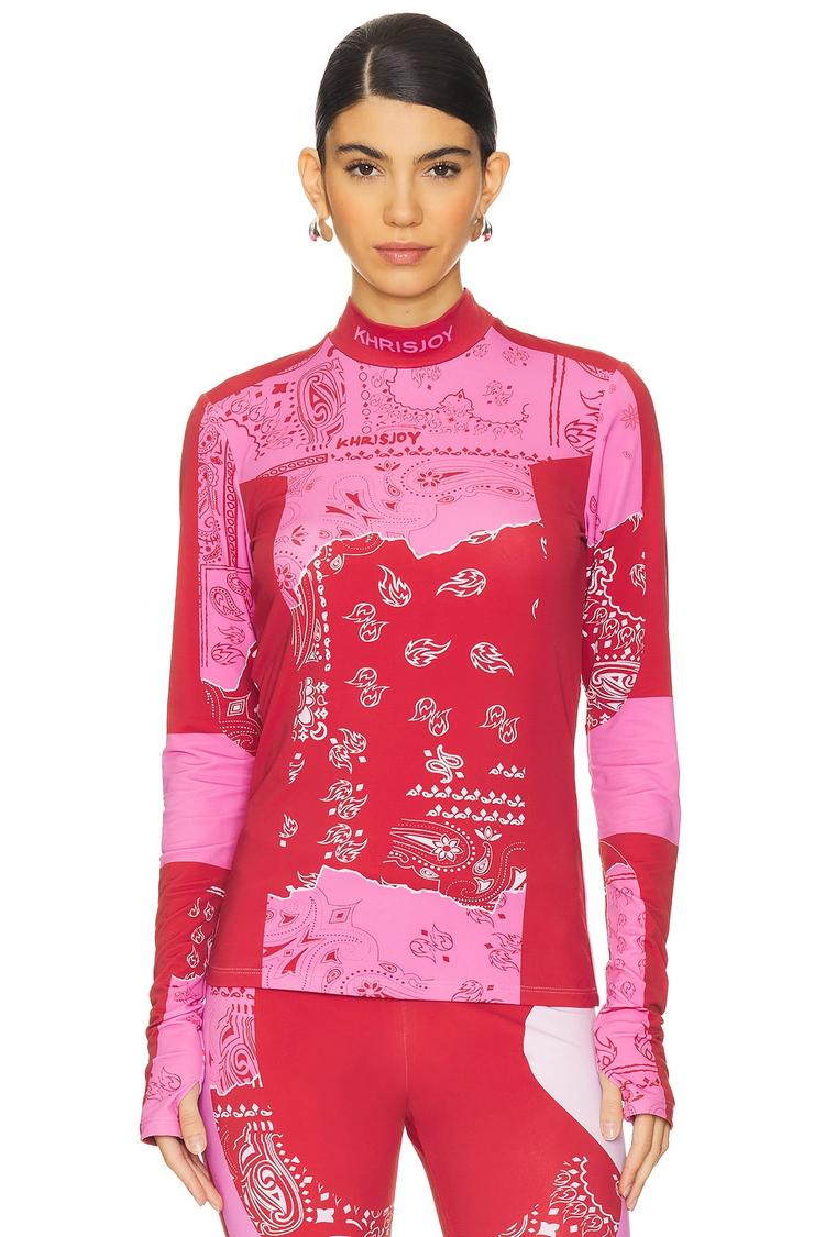 Close-fitting and crafted from a blend of polyamide and elastane, this high-neck base layer shirt features a vibrant red and pink patchwork pattern that covers the entire hip-length silhouette. Designed with long regular sleeves incorporating thumbholes, it combines modern sporty chic style with functional thermal fabric perfect for autumn and winter. Its pullover closure and covered back enhance comfort for casual wear, workouts, and athleisure activities. The elastic thermal fabric ensures warmth while maintaining breathability, making it an ideal choice for layering during cooler seasons.