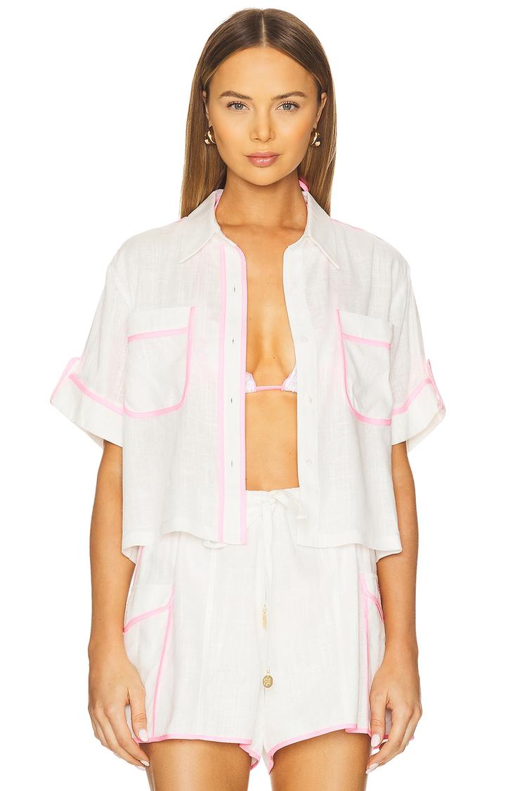 Lightweight linen and rayon blend fabric with a semi-sheer finish brings breezy comfort to this cropped shell shirt. Featuring a loose fit, cuffed half sleeves, and a mandarin collar, it is detailed with front patch pockets and contrast pink trim for a subtle pop. The front button closure and cropped length add to its casual chic vibe, perfect for spring and summer days. Ideal for beach vacations, casual outings, and everyday wear, this versatile piece pairs effortlessly with shorts or skirts for an easygoing, stylish look.