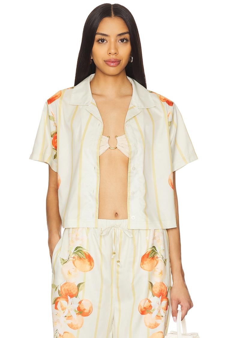 Lightweight satin fabric and a relaxed boxy fit define this Ruby Short Sleeve Boxy Shirt by La Porte. Featuring a waist-length hem, notch lapel collar, and half sleeves, this modern shirt is adorned with an all-over floral and striped pattern in vibrant orange and soft green hues on a cream base. The front button closure adds classic appeal, making it ideal for casual days, brunch outings, or everyday wear during spring and summer. Its smooth polyester texture offers a subtle sheen, blending comfort and style effortlessly.