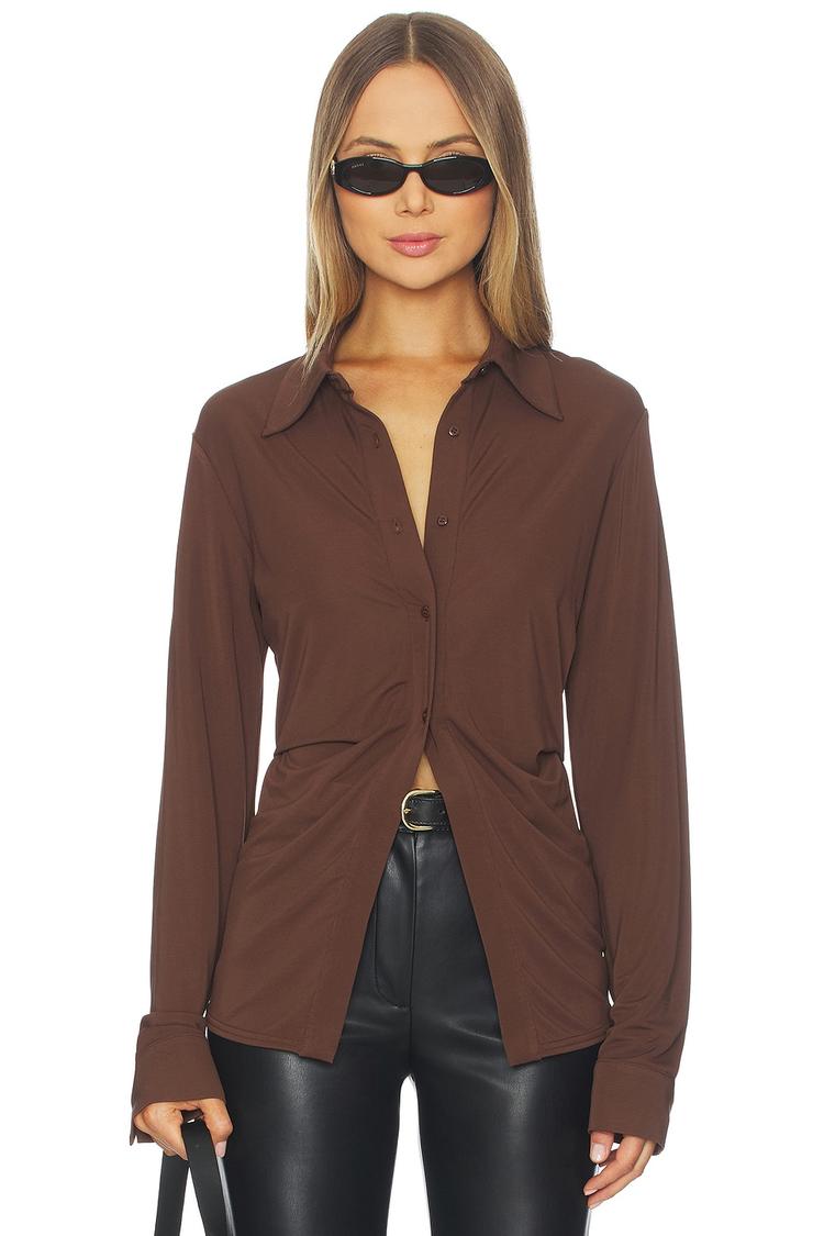 Soft, stretchy viscose fabric and a loose fit combine with a classic collar and button closure for an effortlessly chic look. The Kai Shirt features long sleeves with buttoned cuffs and a unique side ruching detail that adds subtle texture and shape to the hip-length silhouette. Its minimalist design in matte brown makes it versatile for casual outings, business casual settings, and weekend brunches. This modern, comfortable shirt pairs well with leather pants or tailored trousers, offering a refined yet relaxed vibe across multiple occasions and seasons.