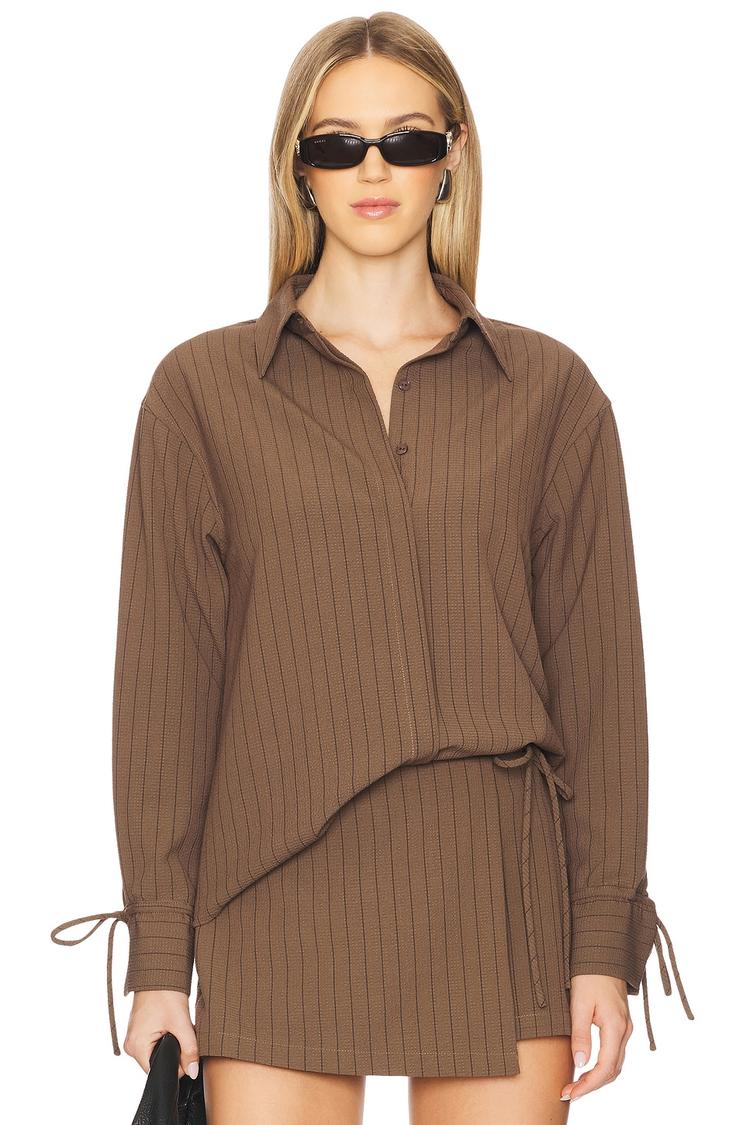 Softly textured in lightweight poplin, this classic blouson shirt offers a relaxed fit with long cuffed sleeves tied in delicate bows for a subtle feminine touch. The hip-length hem and front button closure with a crisp collar create a polished yet effortless look. Featuring an all-over fine striped pattern in shades of brown, this versatile shirt is ideal for casual days, business casual settings, or workwear. Crafted with a polyester-rayon-elastane blend, it ensures comfort and ease throughout all seasons, making it a refined staple for your wardrobe.