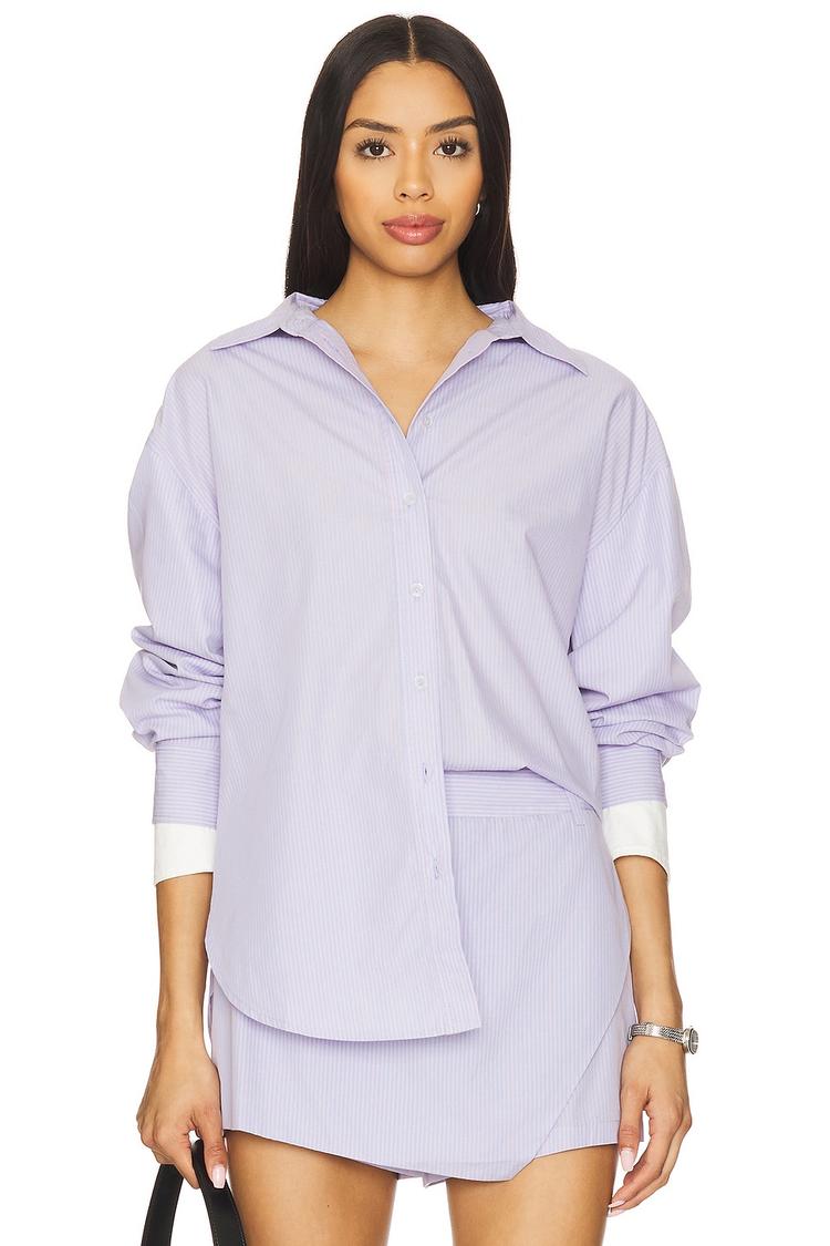 Soft midweight broadcloth fabric in a light lavender shade lends a sophisticated yet relaxed vibe to this classic shirt. Featuring a thigh-length hem and a collar neckline, it offers a comfortable, relaxed fit enhanced by long cuffed sleeves with faux layered styling. The all-over subtle striped pattern adds refined texture, while the front button closure keeps it timeless. Ideal for casual days, workwear, and business casual settings, this versatile piece pairs effortlessly with tailored pants or skirts for brunch or meetings.