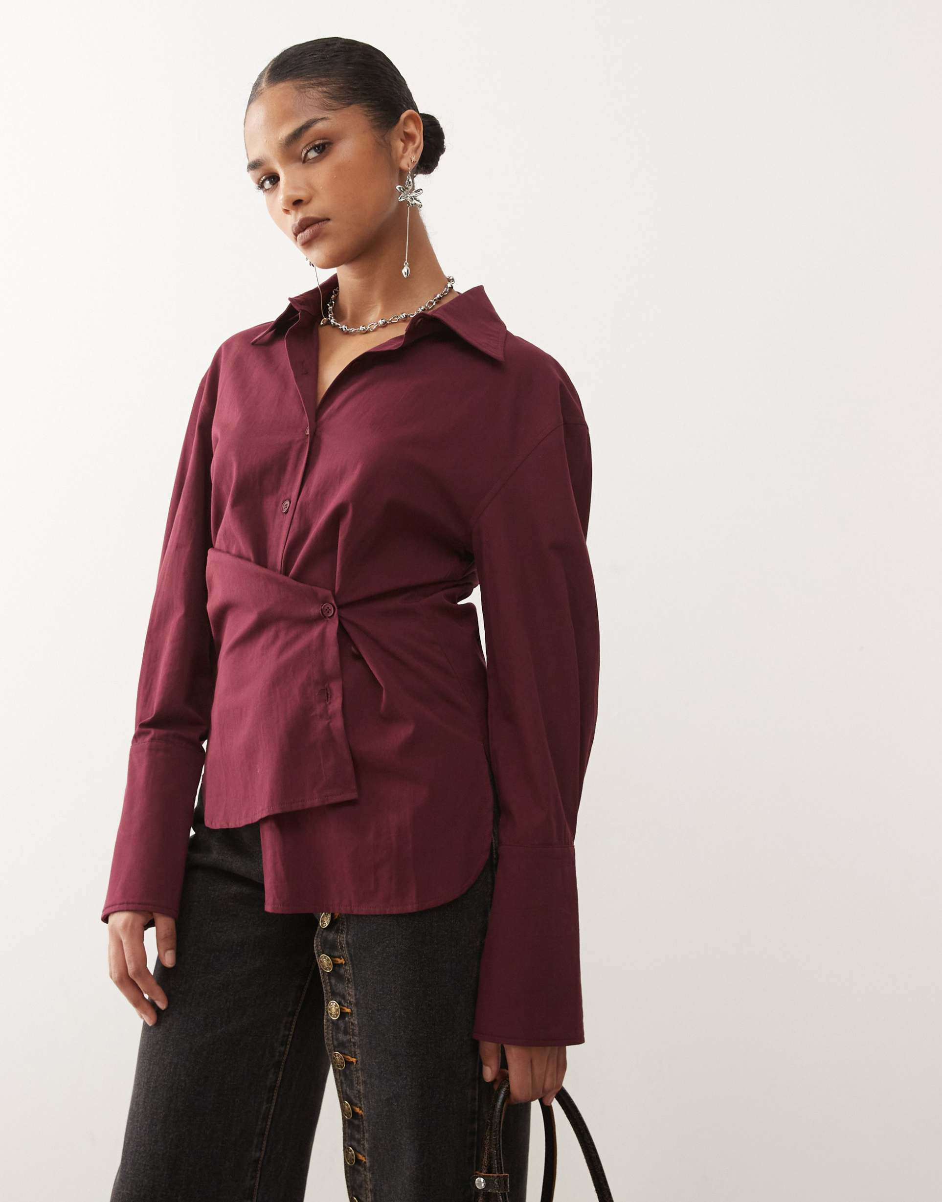 LIONESS SYDNEY COLLAR DETAIL MULTIWAY BUTTON FRONT CINCHED WAIST SHIRT IN BURGUNDY - PART OF A SET