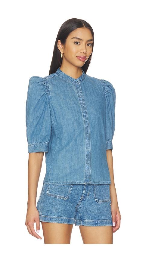 MADEWELL DENIM PUFF SLEEVE BAND COLLAR SHIRT IN BLUE.