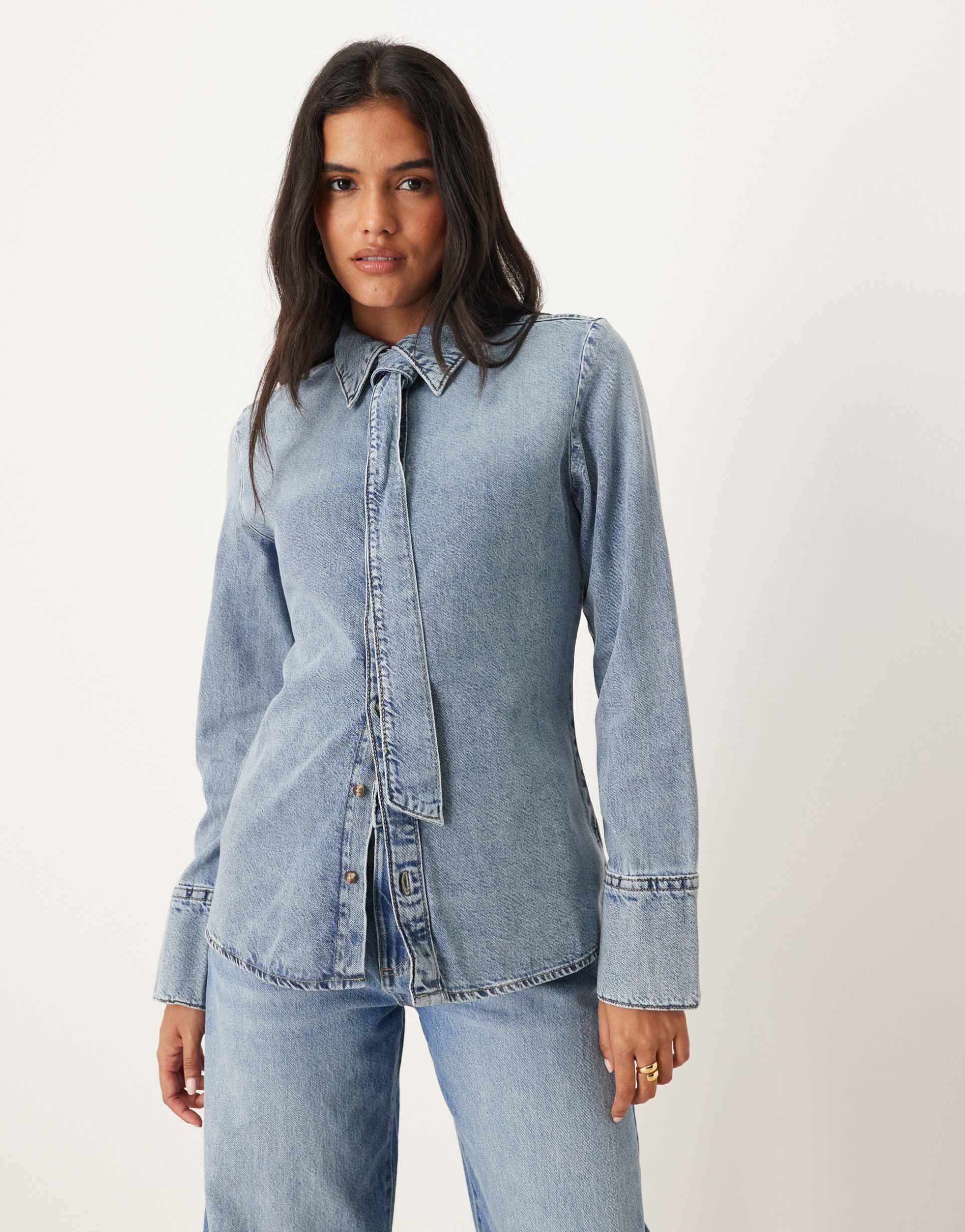 MANGO COTTON MIX LONG SLEEVE DENIM SHIRT WITH TIE NECK IN MEDIUM BLUE