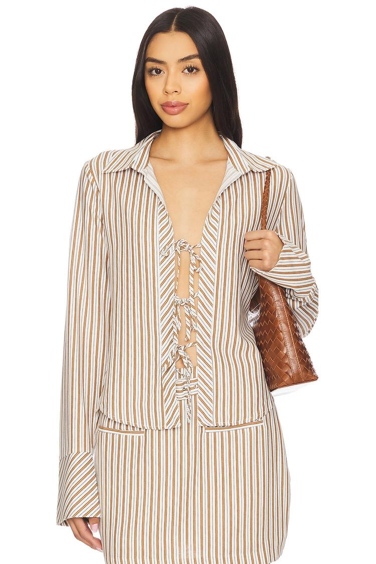 Softly striped in beige and brown, this relaxed fit shirt features a classic collar and long regular sleeves for timeless appeal. Crafted from a midweight blend of viscose and linen, it provides breathable comfort ideal for spring through autumn. The hip length hem and front self-tie closure add a subtle, stylish detail to its minimalist design. Perfectly suited for casual days, brunch outings, and workwear, this piece balances ease and sophistication with its understated pattern and versatile silhouette.