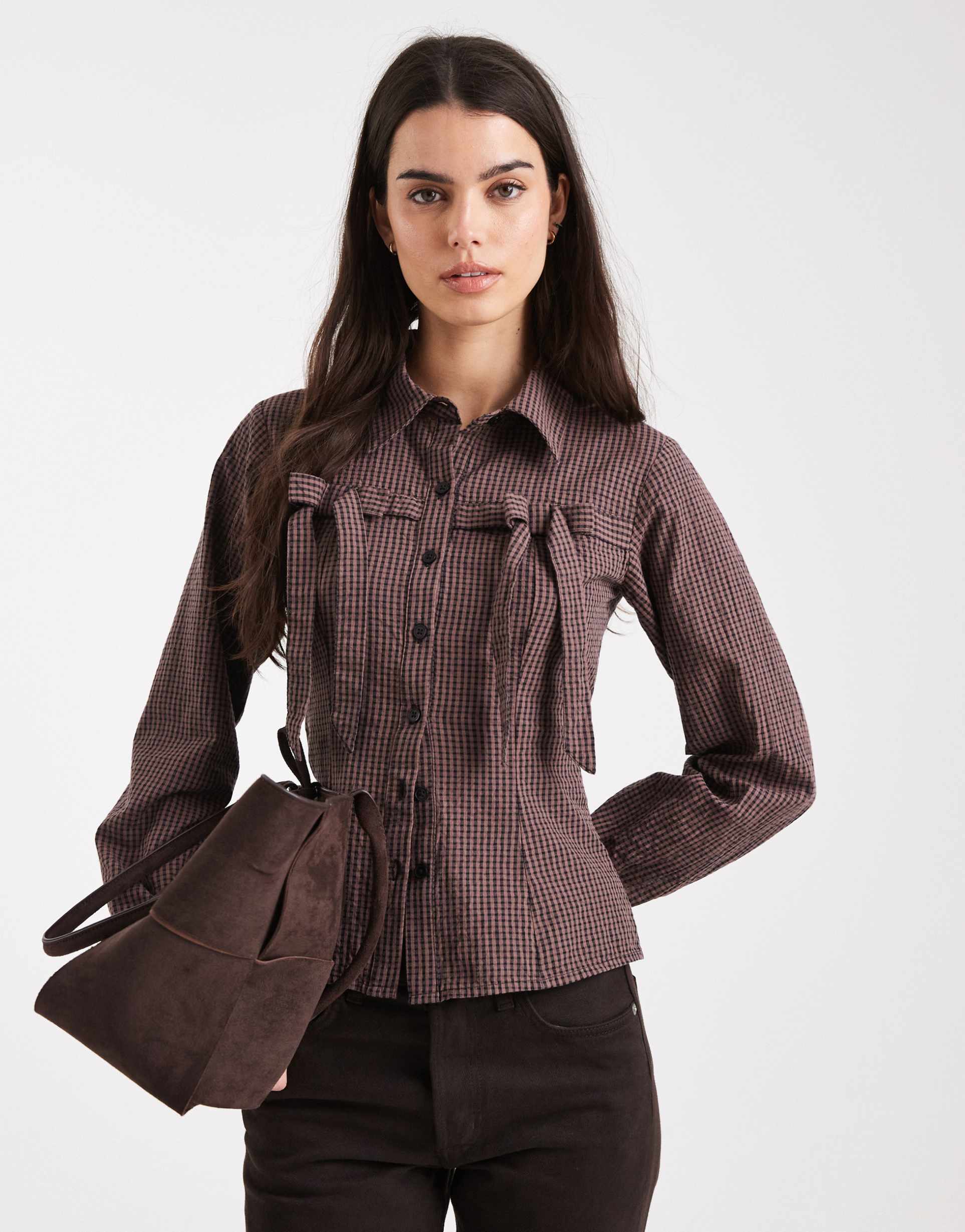 MISS SELFRIDGE BOW DETAIL SHIRT IN BROWN GINGHAM