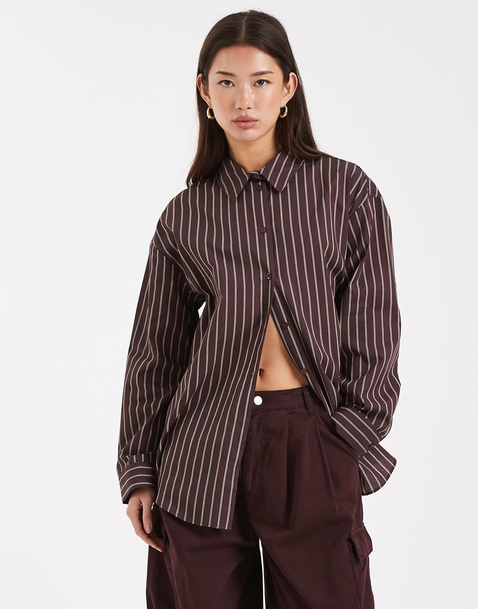 Effortlessly stylish, this oversized poplin shirt in chocolate brown stripes features a classic point collar and long sleeves, offering a relaxed yet polished silhouette. Crafted from breathable cotton with a plain-woven texture, it combines comfort with timeless appeal. The hip-length cut and button closure make it versatile for casual streetwear, business casual settings, or weekend brunches. The striped pattern adds subtle visual interest, ensuring this shirt pairs perfectly with both tailored trousers and relaxed denim for a chic, laid-back vibe.