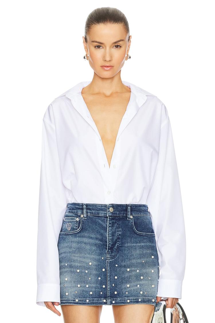 Crisp white polyester fabric shapes this classic button-up shirt, featuring a relaxed, loose fit and long sleeves with buttoned cuffs. Its V-neckline adds a modern twist to the traditional shirt silhouette, ending at hip length for versatile styling. The front button closure and pristine white buttons enhance its minimalist chic appeal. Ideal for casual outings, business casual settings, or brunch dates, this timeless piece offers effortless elegance and comfort across seasons.