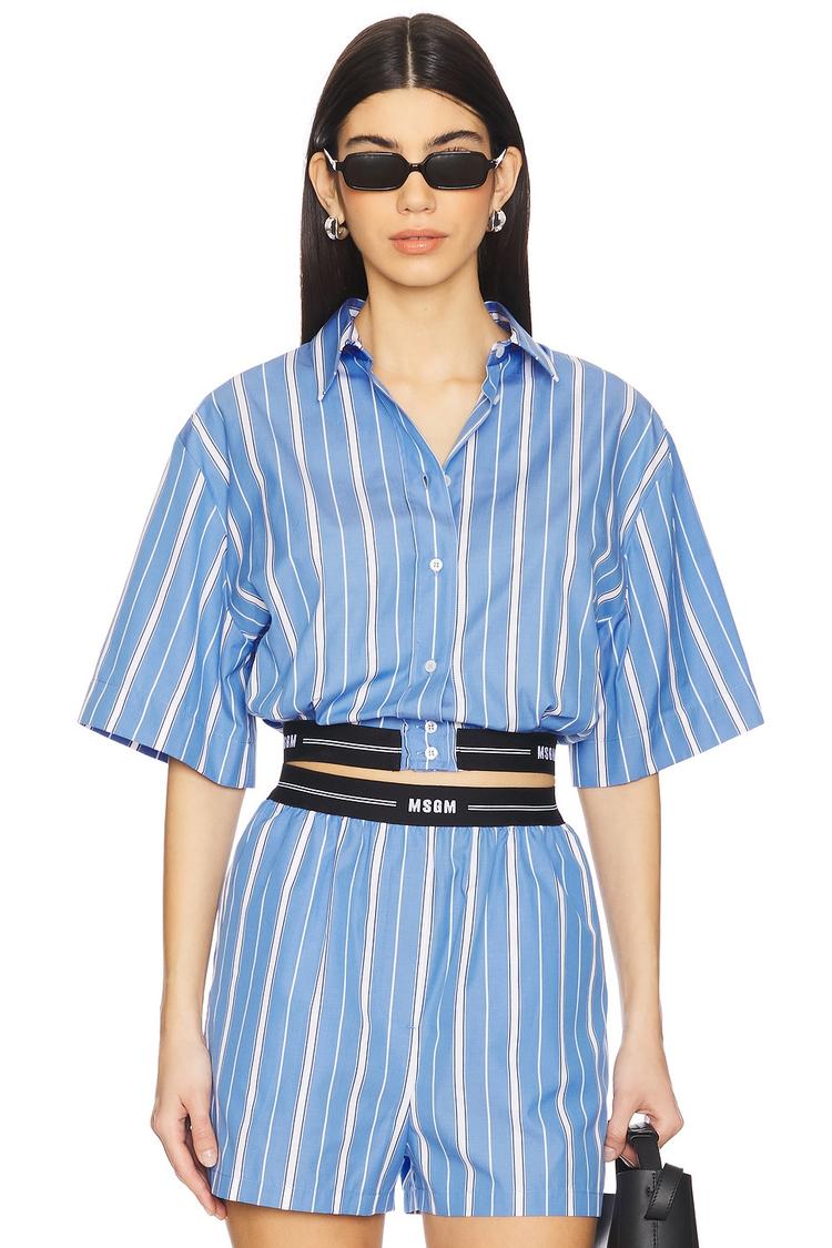 Classic blue and white stripes adorn this relaxed fit shirt crafted from 100% cotton poplin. Featuring a hip-length boxy silhouette with a crisp collar and half-length regular sleeves, it offers casual comfort with a polished edge. The front button closure and elastic underband add subtle design interest and ease of wear. Perfect for casual outings, brunch dates, and everyday wear during spring and summer, this timeless piece blends minimalist style with versatile comfort.