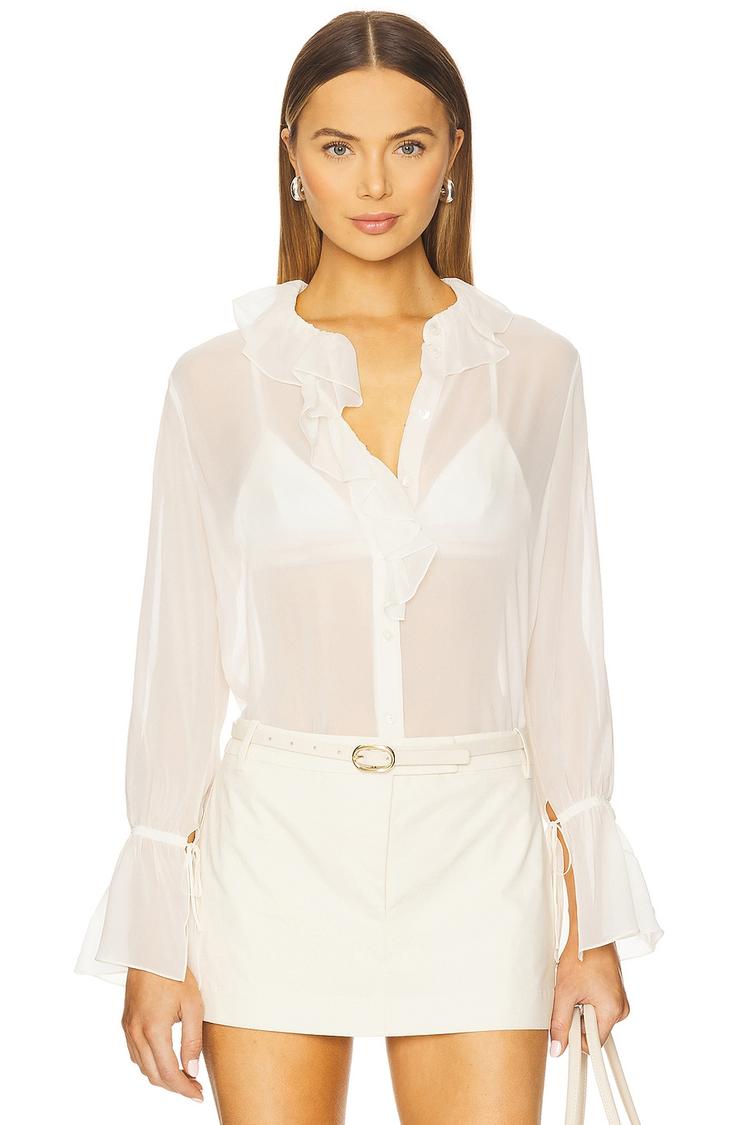 Lightweight sheer chiffon silk fabric and elegant ruffled collar define this hip length shell blouse. Featuring long sleeves with flounce cuffs tied with delicate bows, its hidden front button closure enhances the sophisticated look. The regular fit and classic white hue make it a versatile choice for workwear, business casual settings, brunches, or date nights. This refined piece pairs beautifully with tailored trousers or skirts to elevate your wardrobe with timeless charm and subtle feminine details.