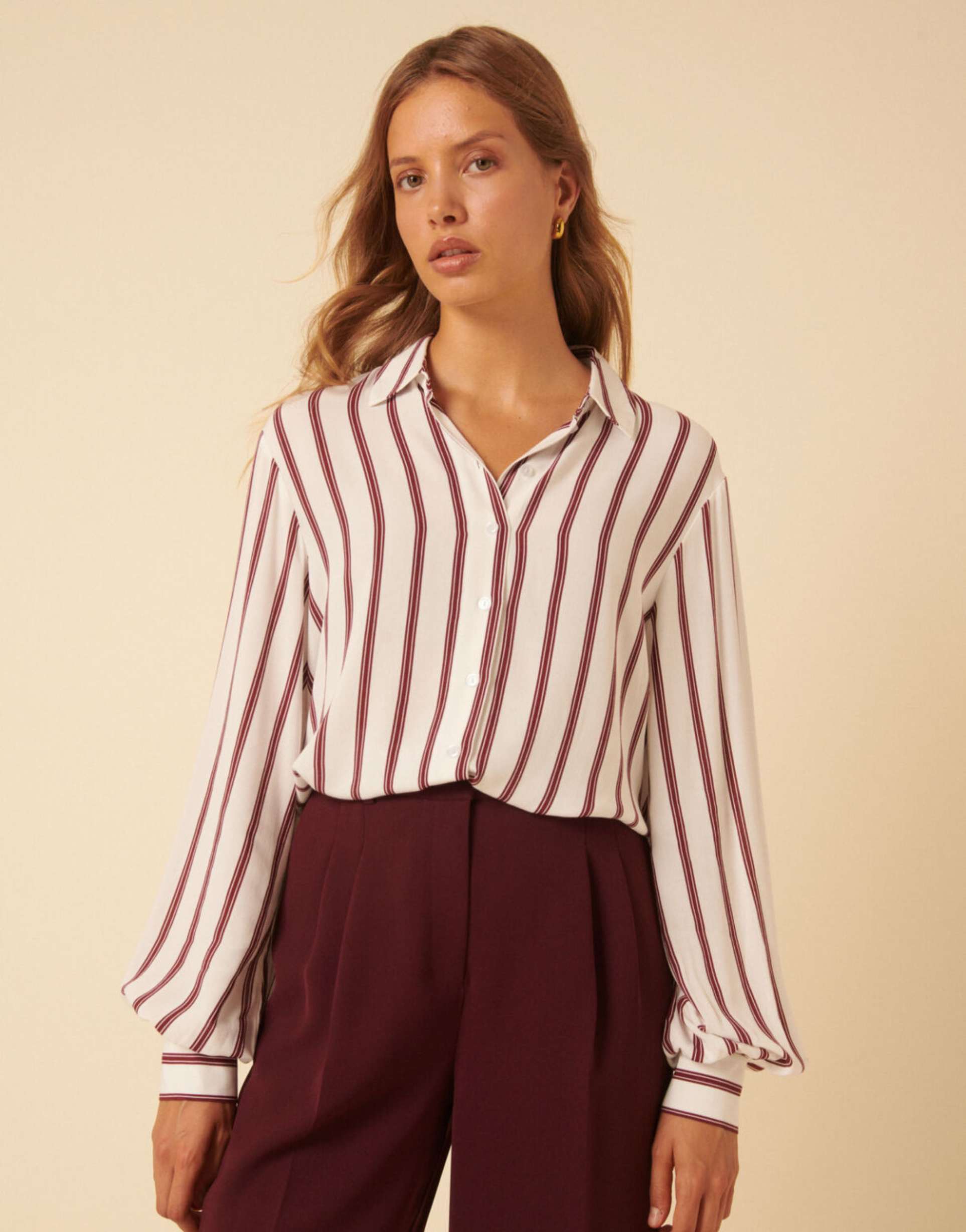 Classic brown and white stripes define this viscose button-up Henley shirt, featuring a spread collar and long regular sleeves. Its regular fit and hip-length silhouette offer effortless style and comfort, making it an ideal choice for casual outings, workwear, or business casual settings. The all-over striped pattern adds timeless appeal, while the front button placket enhances functionality. This versatile top pairs seamlessly with tailored trousers or skirts, delivering a polished look suitable for spring through autumn seasons.