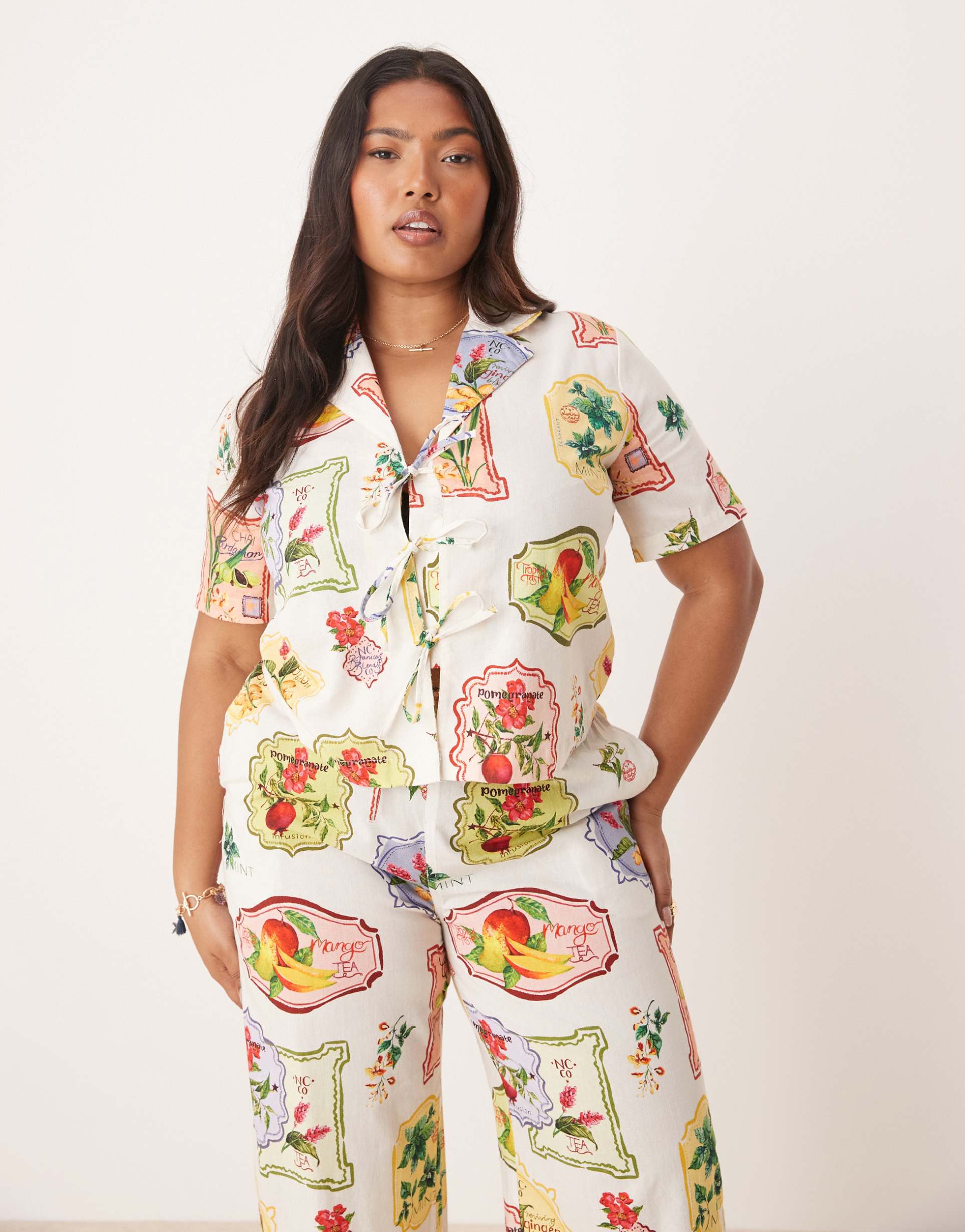 NOBODY'S CHILD PLUS HARPER TIE DETAIL SHIRT IN POSTCARD FRUIT PRINT - PART OF A SET