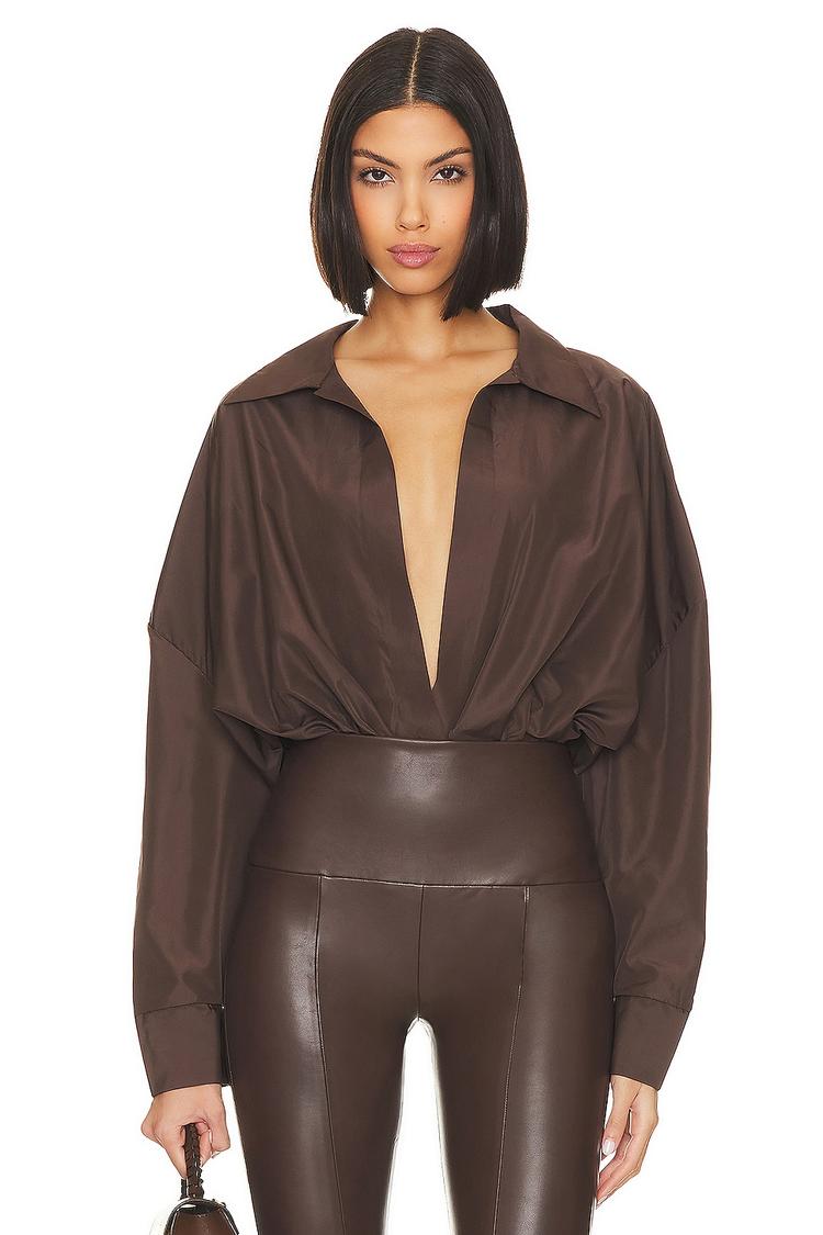 Rich chocolate brown satin shapes this oversized boyfriend shirt bodysuit, designed with a daring plunge neckline and split cuffs that add a subtle edge. Its relaxed fit and long sleeves create a striking silhouette that blends modern allure with effortless comfort. The lightweight poplin fabric lends a smooth texture, making it ideal for night outs, date nights, and girls' nights where standout style is a must. Pair it with high-waisted bottoms for a chic, fashion-forward look that exudes confidence and sophistication.