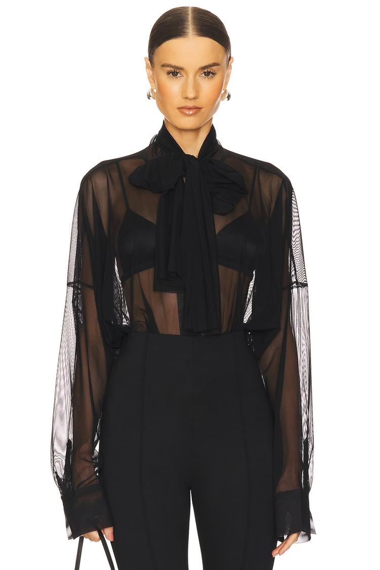 Sheer black mesh fabric and an oversized boyfriend fit define this hip-length bodysuit, featuring a distinctive tie neck and long regular sleeves. Crafted from a lightweight nylon-elastane blend, it offers a modern, edgy silhouette perfect for casual outings, brunch dates, or night events. The front tie and single velcro closure add subtle functional style, while the sheer design ensures a bold, chic statement piece to layer or wear solo with confidence.