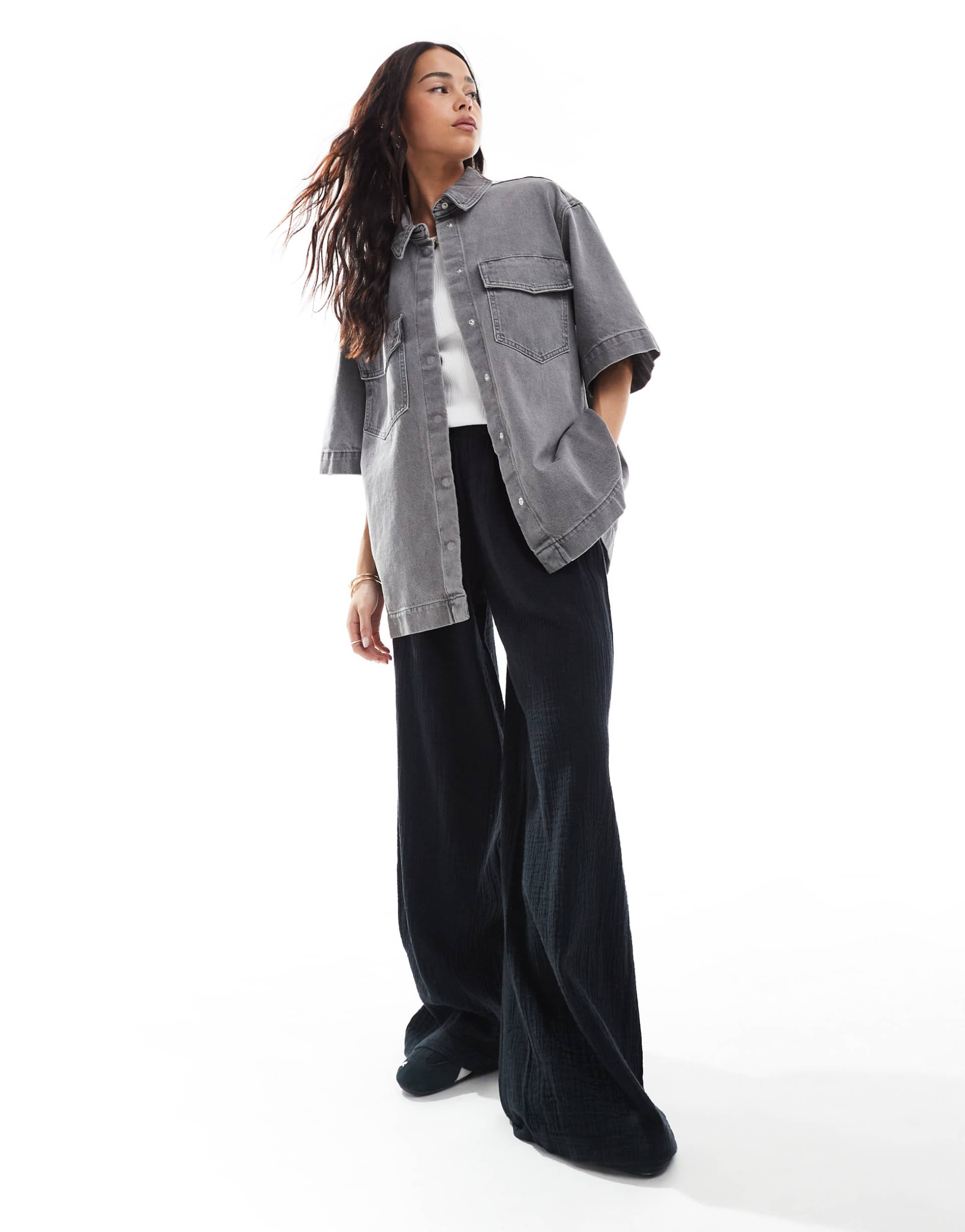 Relaxed yet structured, this oversized gray denim shacket features short half sleeves and a classic spread collar, perfect for layering. Crafted from 100% cotton denim with a matte finish, it offers a casual chic vibe with front chest pockets adding practical design details. The snap button placket enhances ease of wear, making it a versatile piece for casual outings, street style looks, and everyday wear across spring, summer, and autumn seasons.