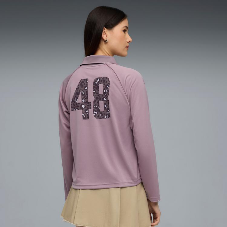 PUMA ESSENTIALS ANIMAL PRINT WOMEN'S LONG SLEEVE POLO SHIRT IN PURPLE, SIZE L