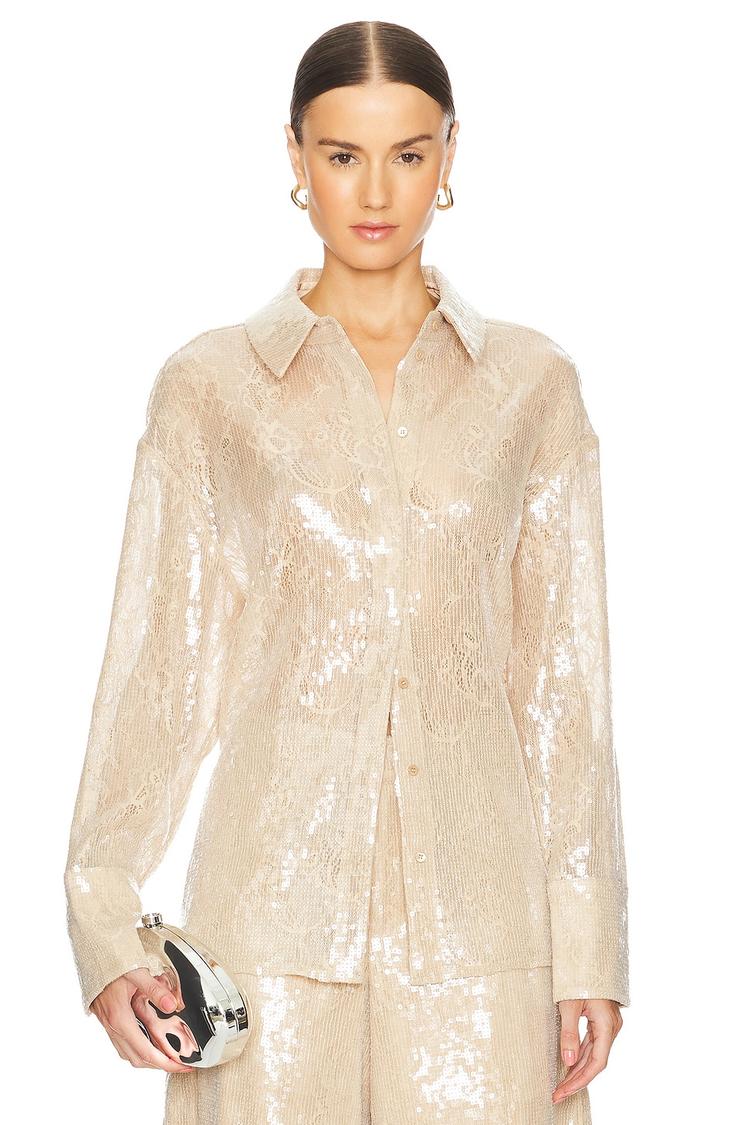 Shimmering beige sequins embellish this hip-length shirt crafted from a lightweight nylon-elastane blend, offering a regular fit with classic long sleeves and a structured collar. The front button closure and button cuffs add to its timeless silhouette, perfect for cocktail parties, semi-formal events, or a sophisticated night out. Its elegant design and all-over sequin detail deliver a refined sparkle that elevates any outfit while maintaining comfortable wearability across seasons.