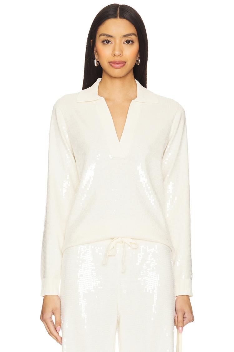 Softly shimmering with lightweight sequin embellishments, this classic shirt features a flattering V-neck and long sleeves for versatile wear. Crafted from a comfortable cotton-wool blend, it offers a regular fit and hip-length silhouette that easily transitions from workwear to casual brunch or elegant night outs. The covered back and pullover style ensure a sleek, polished look, while the off-white hue adds timeless sophistication. Perfect for those seeking an understated sparkle with a refined touch suitable for multiple seasons and occasions.