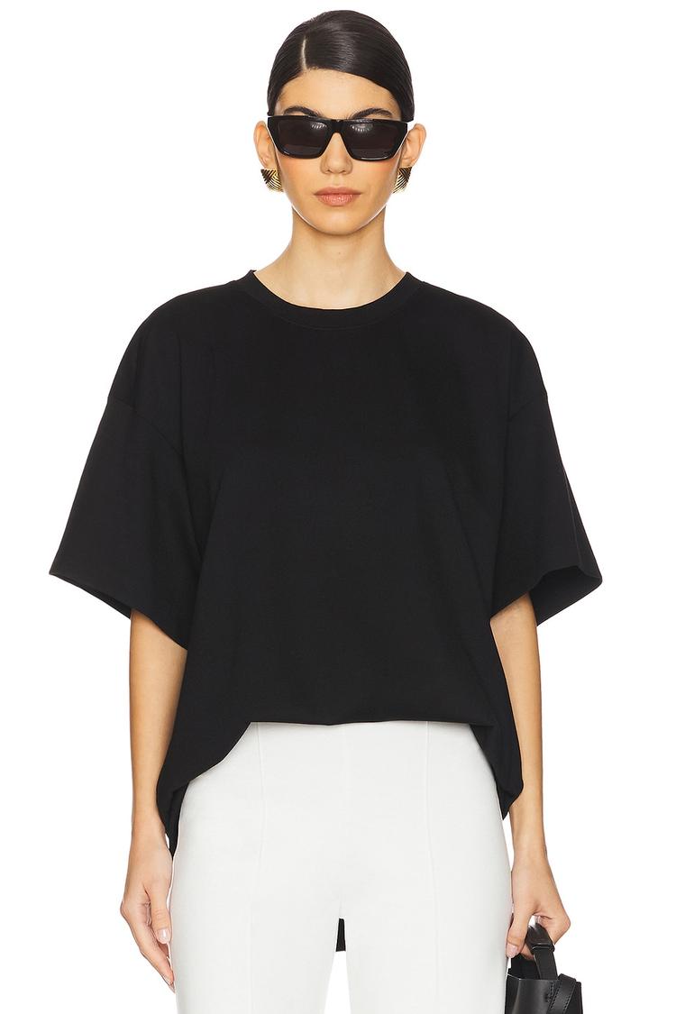 Effortless and relaxed, this matte black boxy shirt offers a loose fit with half sleeves and a classic crew neckline. Crafted from a heavyweight jersey blend of viscose, nylon, and elastane, it ensures comfort and durability. The pullover design and hip-length hem make it an easy-to-wear staple, perfect for casual days, streetwear looks, or cozy loungewear. Its minimalist, casual chic style complements versatile wardrobes for all weather seasons, delivering understated sophistication with every wear.