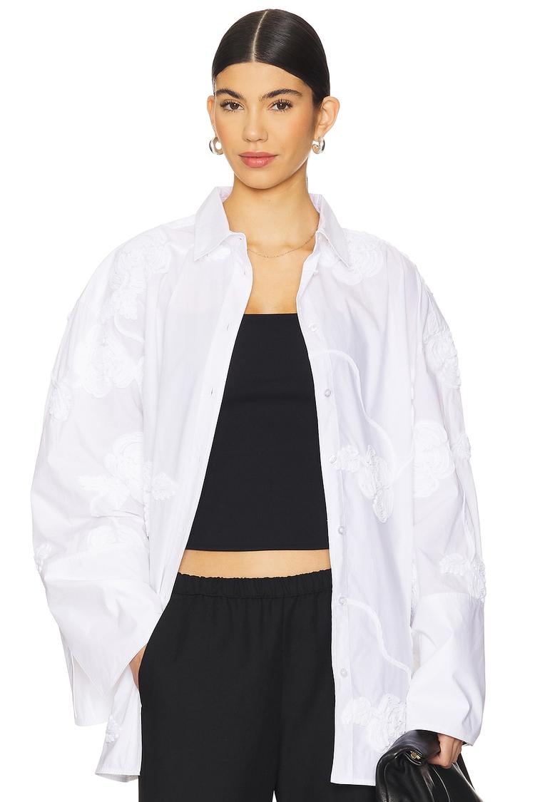 Textured floral embroidery and semi-sheer organic cotton combine in this elegant shirt with a relaxed, loose fit. Featuring a classic turn-down collar, long regular sleeves with button cuffs, and front button closure, its hip-length silhouette provides versatile layering options. Crafted in midweight poplin fabric, this minimalist white shirt is perfect for casual wear, workwear, or brunch outings, balancing sophistication with breathable comfort across spring, summer, and autumn seasons.