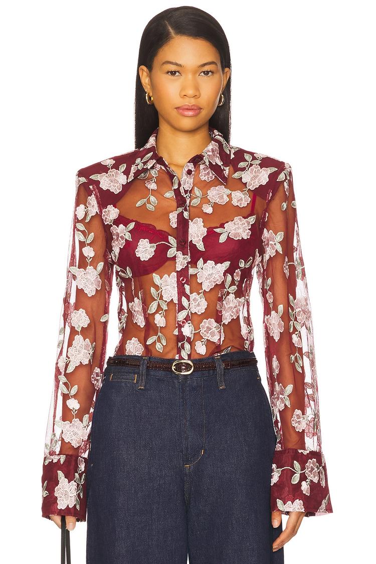 Delicate sheer mesh fabric in a deep burgundy hue is artfully adorned with off-white floral embroidery, creating a stunning contrast on this fitted hip-length shirt. Featuring a classic collar, long regular sleeves with buttoned cuffs, and padded shoulders, it blends modern sophistication with a sexy edge. The front button closure adds timeless polish, making it a versatile piece for casual outings, date nights, or chic brunches. This lightweight polyester mesh shirt elevates your wardrobe with its flattering silhouette and intricate detailing, perfect for making a confident statement.