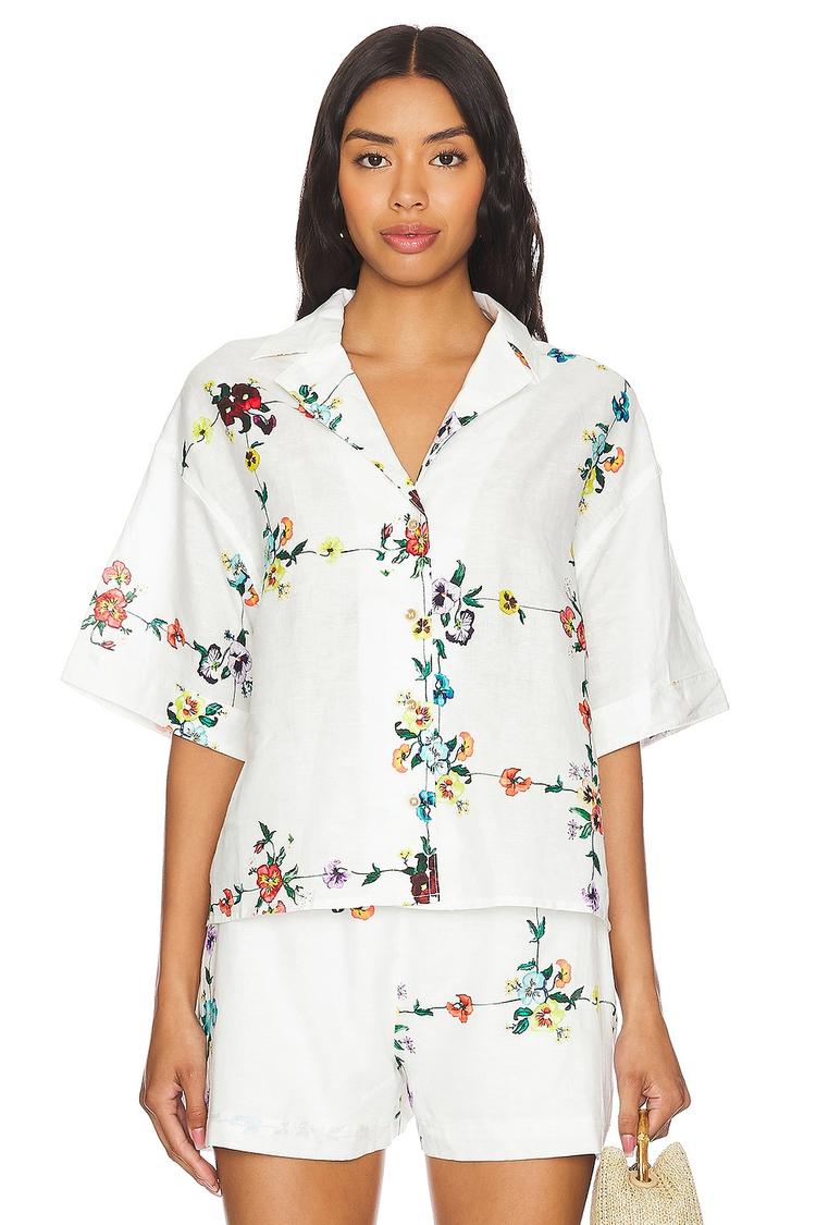 Lightweight linen-cotton blend fabric combines with a loose, boxy fit for an effortlessly cool vibe in this Santana Shirt. Its hip-length silhouette features a classic notch lapel neckline and half sleeves with wide straps, adorned with vibrant all-over floral prints in red, yellow, blue, and green on a crisp white base. The front button closure adds casual ease, making it an ideal choice for spring and summer outings. Perfect for casual days, brunches, or vacation wear, this shirt offers breathable comfort with a laid-back bohemian chic style.
