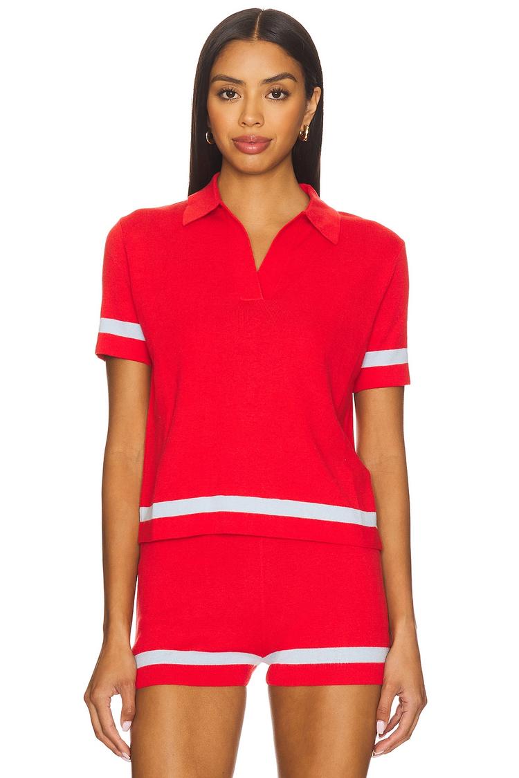 Classic red knit polo shirt crafted from a comfortable cotton-acrylic blend offers a midweight texture perfect for transitional seasons. Featuring a regular fit with half sleeves and a traditional polo collar, this hip-length pullover balances sporty and casual chic vibes. The clean solid red base is accented with white contrast stripes on sleeves and hem for a timeless, versatile look. Ideal for casual outings, travel, or everyday wear, this knit polo brings effortless style and comfort to your wardrobe.