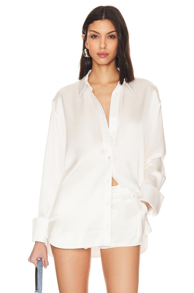 Lightweight satin fabric and a relaxed fit define this classic white shirt with long cuffed sleeves and a neat collar. The front button closure and thigh-length hem lend a versatile, elegant silhouette perfect for workwear, business casual occasions, or casual brunches. Its minimalist design and matte white shade provide a sophisticated, timeless look that transitions seamlessly from day to night.