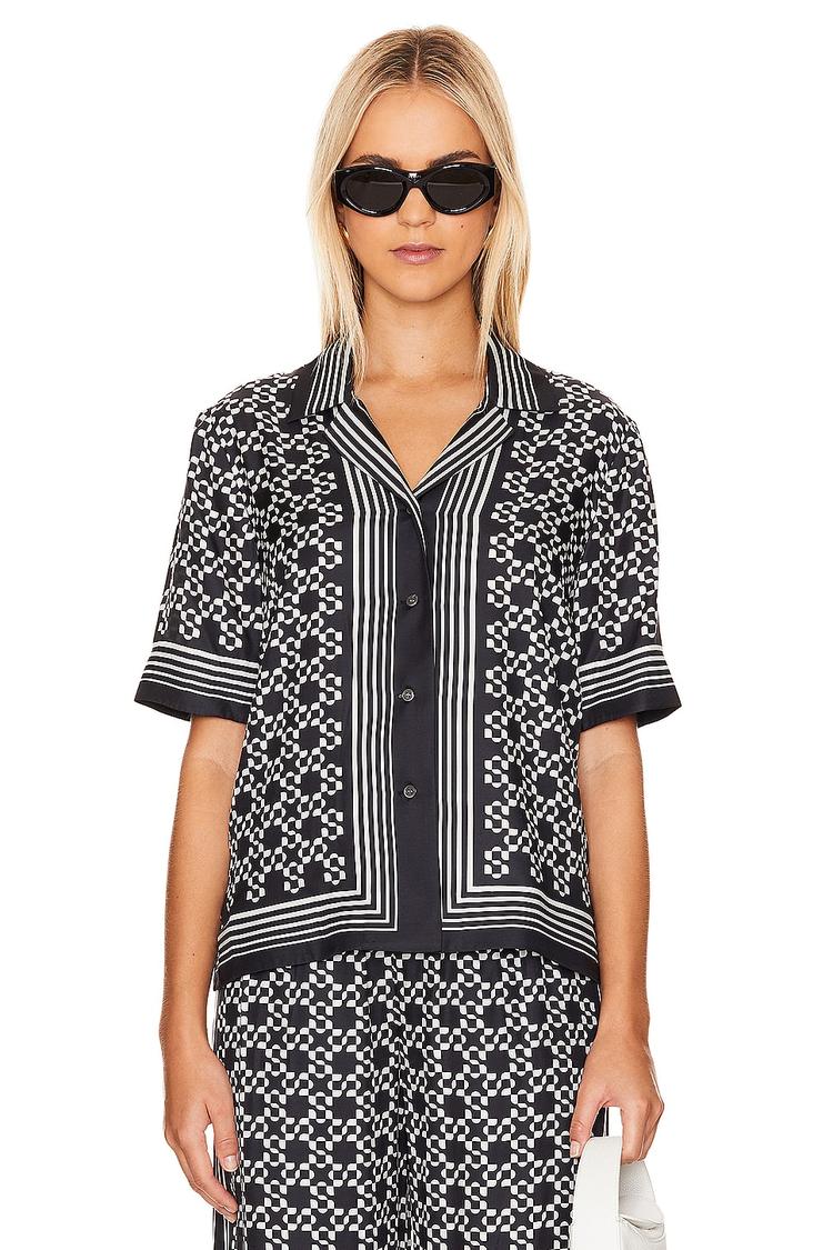 A sophisticated black and white geometric button-down shirt crafted from lightweight silk and lyocell satin fabric offers a relaxed fit with half sleeves finished in cuffed styling. Featuring a notch lapel collar and hip-length hem, this versatile shirt combines classic minimalism with comfort. Its all-over geometric pattern is accentuated by contrasting stripes on the collar, cuffs, and hem, making it an elegant choice for casual outings, business casual settings, or weekend brunches.