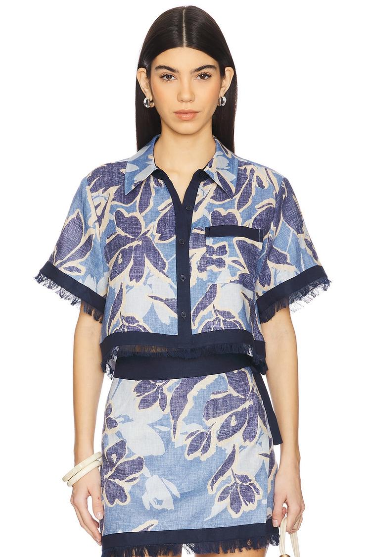 Lightweight linen with a vibrant floral print brings a fresh appeal to this cropped shirt. Featuring a classic collar and half sleeves with regular styling, the shirt has a relaxed regular fit perfect for spring and summer outings. Fringe details along the hem, sleeves, and border add a playful texture contrast. Its front button closure and breast pocket enhance the casual chic vibe, making it suitable for brunch, casual days, or vacation wear. The matte light blue base with dark blue and white floral accents creates a modern, versatile look that pairs effortlessly with high-waisted bottoms.