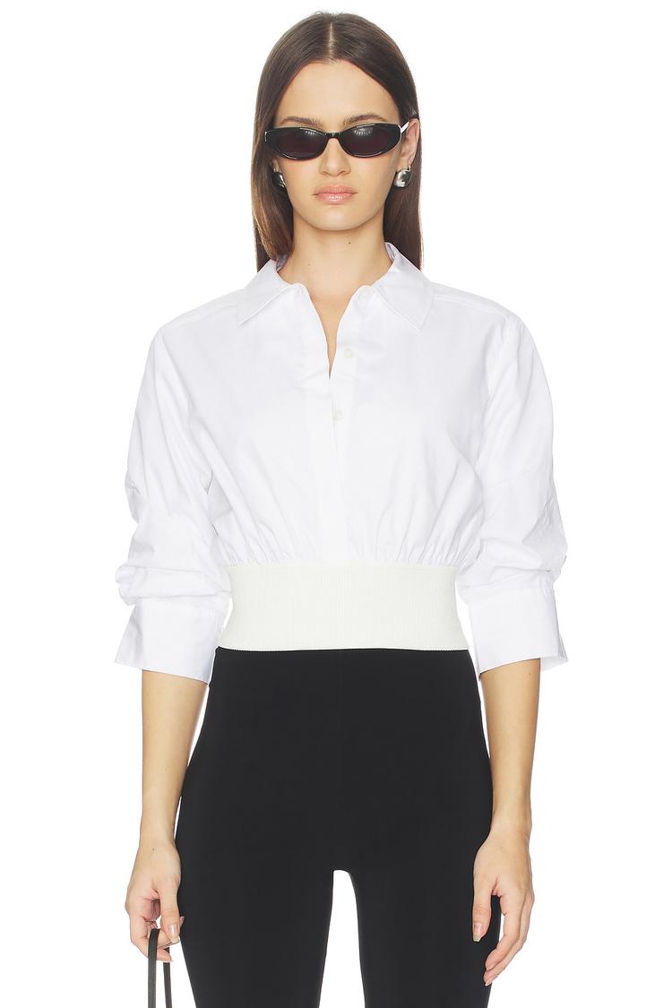 Crisp white cotton poplin shapes this fitted shirt featuring a classic collar and long cuffed sleeves with button closures. The elasticized waistband adds a modern twist, creating a flattering silhouette at waist length. Lightweight and semi-sheer, this shirt balances sophistication with subtle ease, making it ideal for workwear, business casual settings, and weekend brunches. Its minimalist design and breathable fabric ensure comfort and style from spring through autumn.