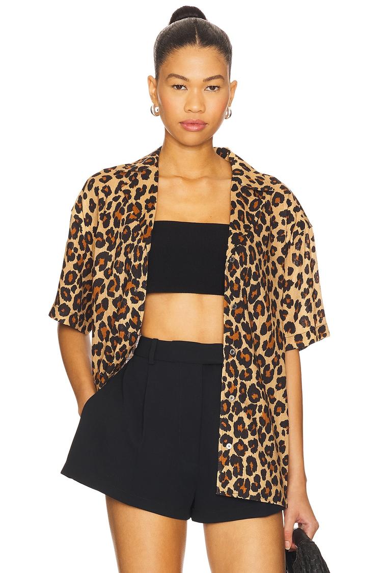 Effortlessly cool and breathable, this Bia Linen Camp Shirt features a loose, boxy fit and a classic notch lapel collar. Crafted from a midweight rayon-linen blend, it boasts an all-over animal print in warm brown and black tones. The half sleeves and hip-length hem add to its casual, relaxed vibe, perfect for spring and summer days. Front button closure enhances its laid-back charm, making it an ideal choice for casual outings, brunches, or vacation streetwear looks.