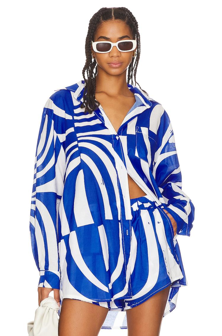 Bold abstract patterns in matte blue and white define this lightweight cotton shacket, featuring a loose fit and classic collar for effortless layering. The front button closure and long sleeves add versatile style, while the hip-length hem offers easy wear for casual outings, workwear, or brunch dates. Crafted from breathable cotton fabric, it delivers comfort and modern minimalism with a relaxed silhouette perfect for spring through autumn seasons.