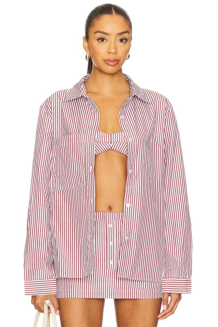 Lightweight poplin fabric and classic red and white stripes define this versatile shacket, featuring a regular fit, long sleeves with button cuffs, and a traditional collar. The hip-length hem and front button closure enhance its timeless appeal, making it suitable for casual outings, workwear, or business casual settings. Its minimalist design and breathable cotton-polyester blend ensure comfort and style across spring, summer, and autumn seasons. The all-over striped pattern adds subtle visual interest without overpowering the look.