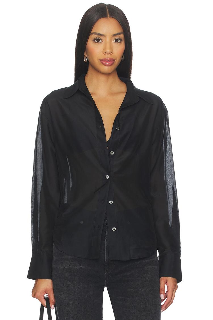 A sheer silk and cotton shell shirt in matte black offers timeless elegance with its notch lapel collar and exposed front button closure. Featuring long regular sleeves and a regular fit, this hip-length shirt is perfect for workwear, business casual settings, and date nights. The sheer construction adds a sophisticated, minimalistic vibe, making it a versatile piece for all weather seasons. Its classic silhouette and subtle luxe fabric blend create a refined and polished look suitable for a variety of occasions.