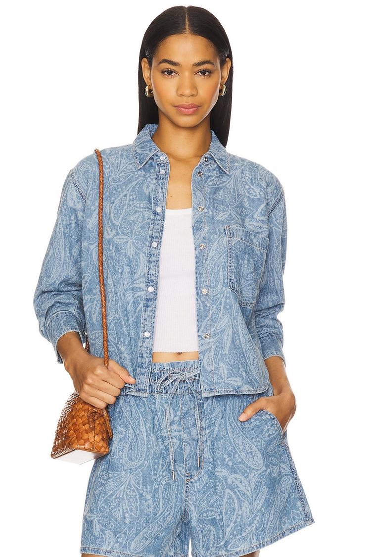 Midweight cotton denim crafted into a cropped shirt featuring a classic collar and long regular sleeves, adorned with an all-over white paisley print on a light blue base. The front snap button closure and snap button cuffs add practical style, while the breast slip pocket enhances its casual chic appeal. This versatile piece offers a regular fit and cropped length perfect for spring and summer outings, brunches, or laid-back streetwear looks.