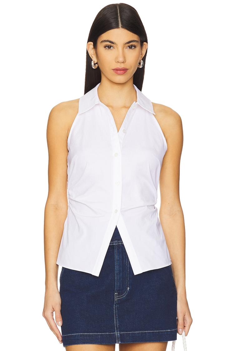 Crisp white poplin fabric with a subtle stretch delivers a clean, fitted silhouette in this sleeveless tank top. Featuring a classic collar and front button closure, the ruching detail at the front adds elegant texture and shape. With its hip length and minimalist style, this versatile piece transitions seamlessly from casual brunches to polished workwear and business casual settings during spring through autumn. The covered back and sleeveless cut provide a flattering, breathable option for warmer days while maintaining a sophisticated edge.