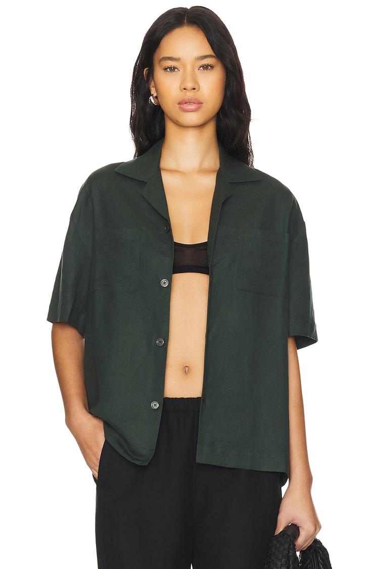 A relaxed boxy linen shirt in a deep matte dark green hue offers effortless style with breathable linen-viscose fabric and a classic notch lapel collar. Featuring half sleeves and a hip-length hem, its front button closure and chest slip pockets add practical charm. Ideal for casual days, workwear, and business casual settings, this minimalist piece combines comfort with timeless appeal, making it perfect for travel and transitional seasons like spring and autumn.