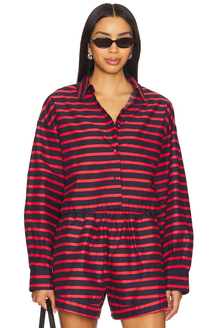 Crisp 100% cotton poplin defines this cropped button-down shirt in a relaxed fit, featuring long cuffed sleeves and a classic turn-down collar. The all-over matte black and red striped pattern lends a timeless yet bold appeal, perfect for casual days, workwear, or business casual settings. Its midweight fabric and cropped length make it versatile for spring and autumn styling, offering both comfort and a polished silhouette. Buttoned cuffs and front button closure enhance the classic look, making this piece a minimalist yet chic wardrobe essential for brunches, meetings, and everyday wear.