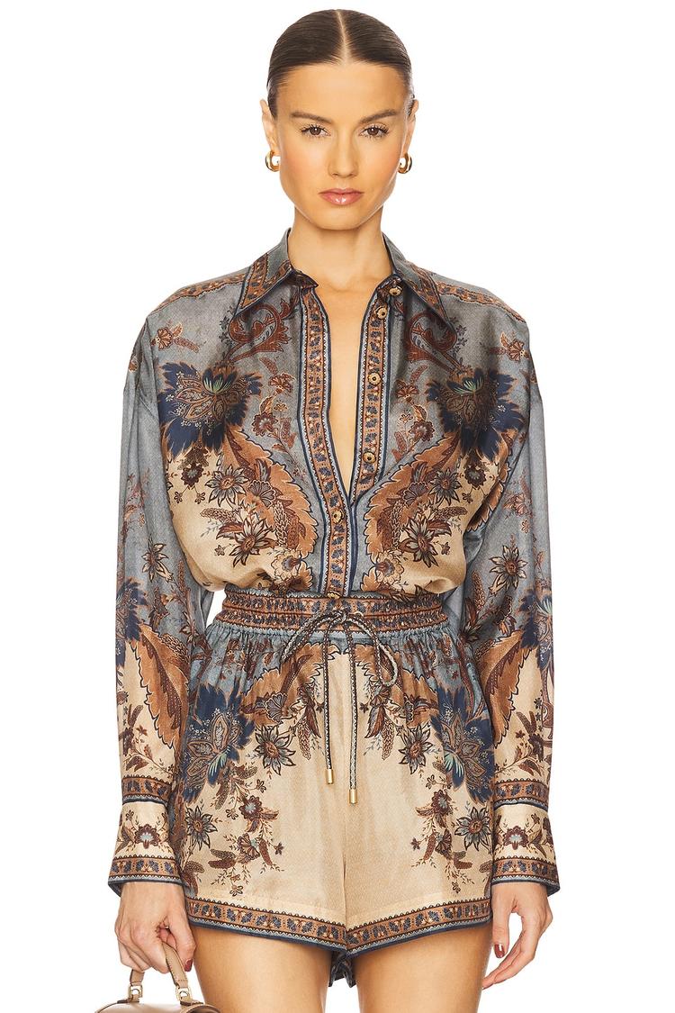 Luxurious silk satin meets timeless elegance in this Ascension Manstyle Shirt. Featuring a classic collared neckline and long button cuffs, its loose fit and thigh-length hem create a sophisticated silhouette. The intricate all-over floral pattern in muted dark blue and brown hues adds a refined touch to the matte beige base, perfect for a chic brunch, casual day out, or romantic date night. Lightweight and breathable, this shirt offers comfort and style through spring to autumn seasons.