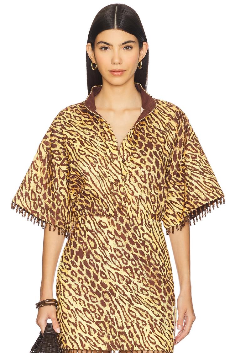 The Coco Beaded Fringe Shirt showcases a classic boxy silhouette crafted from midweight matte cotton twill. Its all-over animal print in tan and brown tones is enhanced by delicate beaded fringe trimming along the elbow-length sleeves and hem. Featuring a mandarin collar and front button closure, this loose-fit shirt offers effortless style and comfort. Ideal for casual outings, brunches, or business casual settings during spring and autumn, it balances bold print with refined detailing to elevate everyday looks with a chic edge.