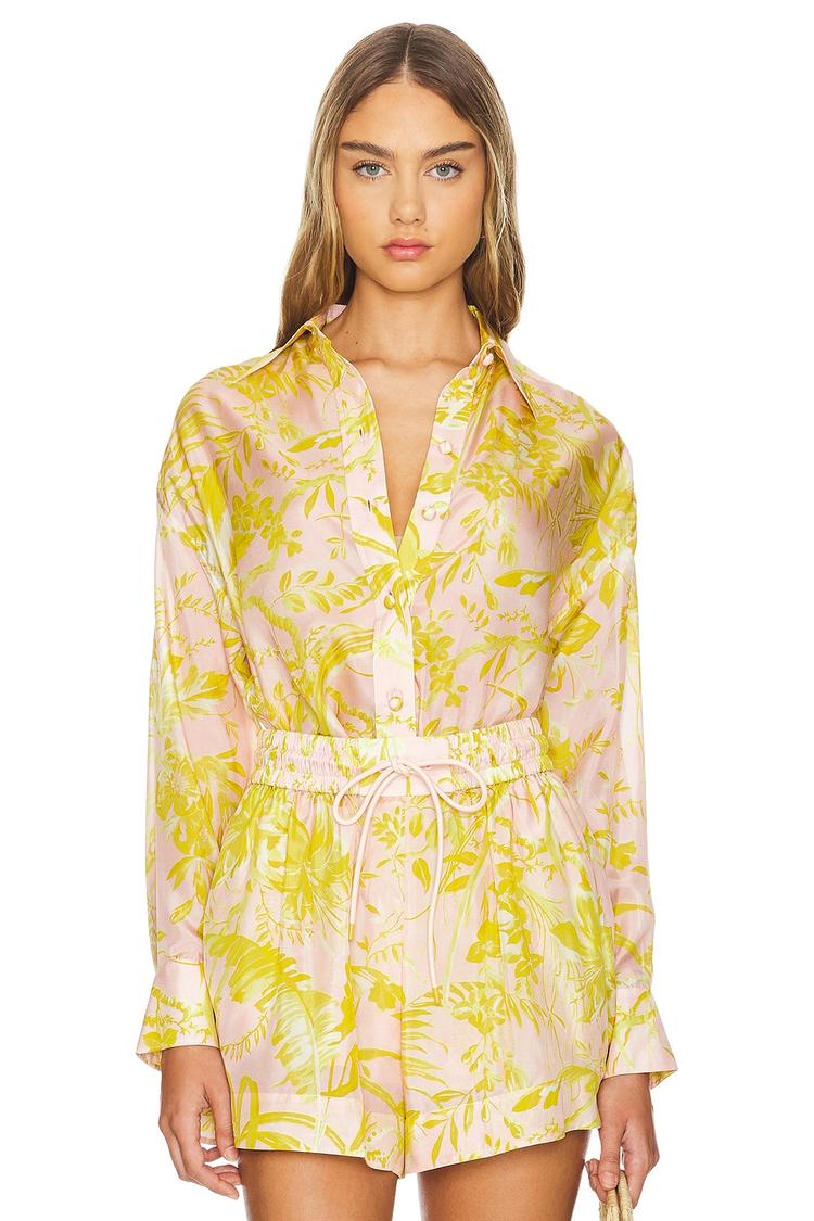 Soft satin silk and a relaxed fit define this classic shirt, featuring a pale pink base adorned with an all-over yellow botanical print. The hip-length silhouette, long regular sleeves with buttoned cuffs, and a traditional collar bring timeless elegance to casual and vacation wardrobes alike. Front button closure adds practicality, while the silk fabric ensures a luxurious feel. Perfect for spring and summer outings, brunch dates, or relaxed travel days, this shirt combines comfort with refined style effortlessly.