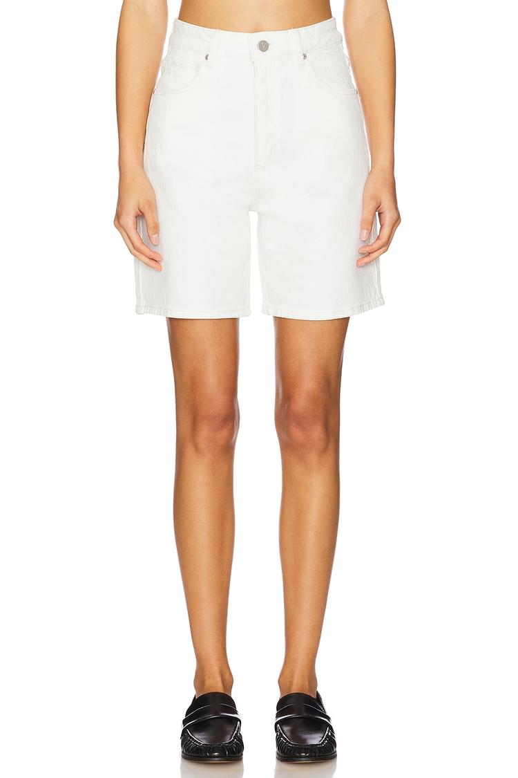 Effortless, clean and endlessly versatile, these white denim Bermuda shorts redefine warm‑weather staples. A mid‑rise silhouette in midweight cotton denim offers a flattering fit with a touch of stretch for all‑day ease. The flat‑front waistband sits neatly at the waist, secured by a classic zip fly and button closure. Five‑pocket detailing maintains practical polish, while the crisp white hue pairs with crop tees, airy blouses, or knit separates for everyday chic. From brunch to vacation days, this timeless pair adds a fresh, minimalist edge to any look.